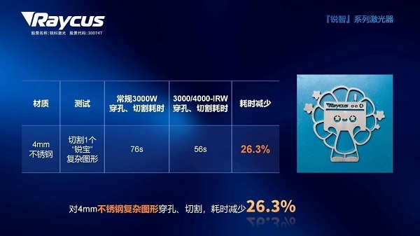 使用常規(guī)3000W激光器和銳智系列3000/4000-IRW激光器對4mm不銹鋼進行復(fù)雜圖形穿孔、切割,其中常規(guī)3000W激光器耗時76s,銳智系列3000/4000-IRW激光器耗時56s,耗時相比減少26.3%。