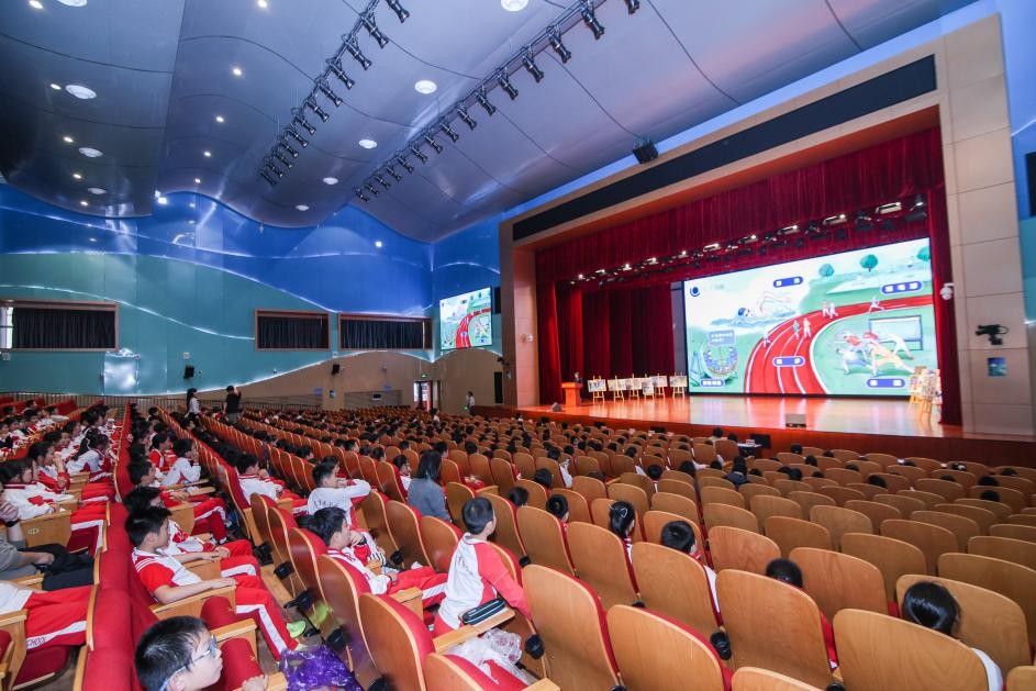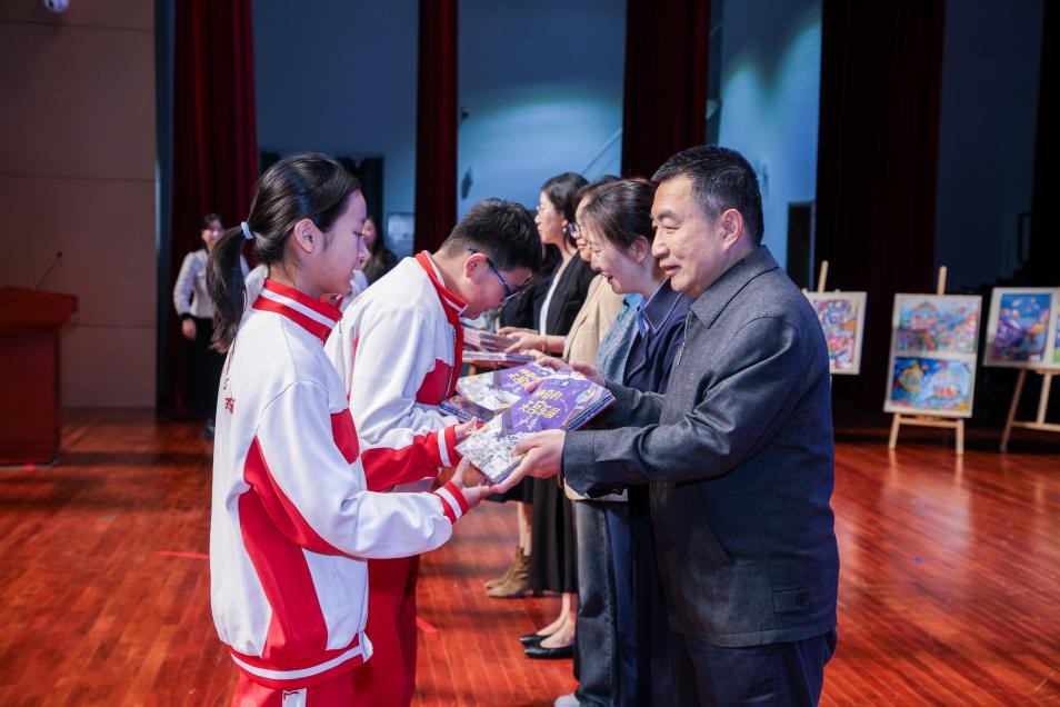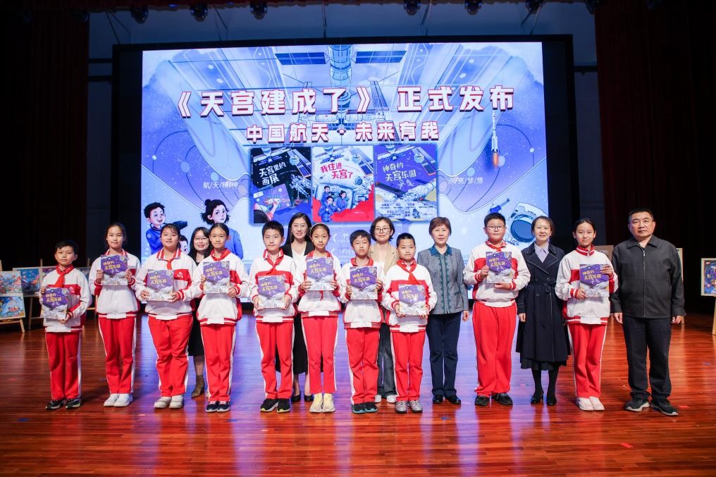 隨后,吳杰、沈立鳳與中國航天科工二院208所二級專務(wù)李曉紅共同觸摸啟動球,主視覺大屏同步呈現(xiàn)繪本封面與“天宮建成了”主題字,標志著這套入選“十四五”國家重點出版物出版規(guī)劃項目的科普繪本正式發(fā)布。緊接著的贈書儀式上,與會嘉賓將繪本贈予學生,為育英校園播撒下航天夢想的種子。