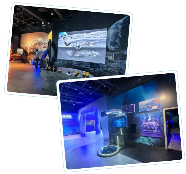 除了嫦娥六號采集的月壤等一系列國寶級展品的展出以外,本次展覽還有一大亮點:項目團隊充分發(fā)揮多媒體集成與軟件開發(fā)優(yōu)勢,創(chuàng)造性地打造了“三航”CAVE沉浸式空間、虛擬現(xiàn)實的“月球基地”、“我的火星生活”“我的祝融號”“我的太陽系”、空間站體驗、“海天對話”等多個自主研發(fā)的展項。其中,迭代升級后的“海天對話”在語音識別能力上有了大幅提升,視頻、音頻、文字等多種內容載體的結合也使得展項交互變得更加豐富。