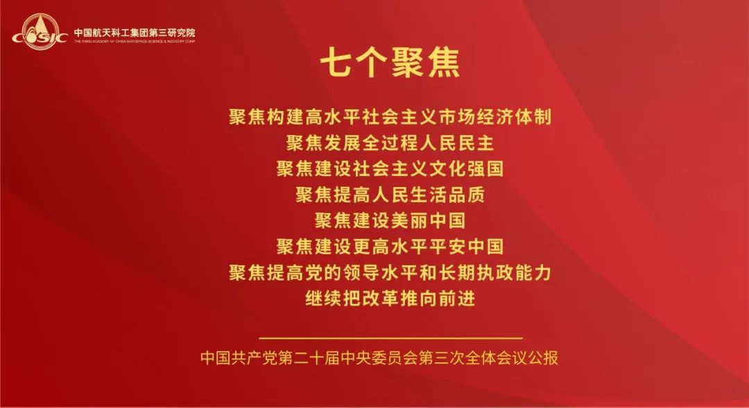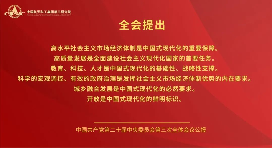 黨的二十屆三中全會,是在以中國式現(xiàn)代化全面推進強國建設、民族復興偉業(yè)的關鍵時期召開的一次十分重要的會議。航天三院黨委將學習好宣傳好貫徹好黨的二十屆三中全會精神作為當前和今后一個時期的一項重大政治任務,高度重視,迅速行動,引導三院全體黨員干部職工把思想和行動統(tǒng)一到全會精神上來,把智慧和力量凝聚到落實全會精神和部署上來,聚焦主責主業(yè),履行強軍首責,持續(xù)推動飛航事業(yè)高質量發(fā)展。