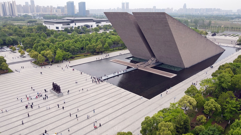 游客在合肥渡江戰(zhàn)役紀(jì)念館參觀游覽(2021年5月3日,無(wú)人機(jī)照片)。新華社記者 周牧 攝