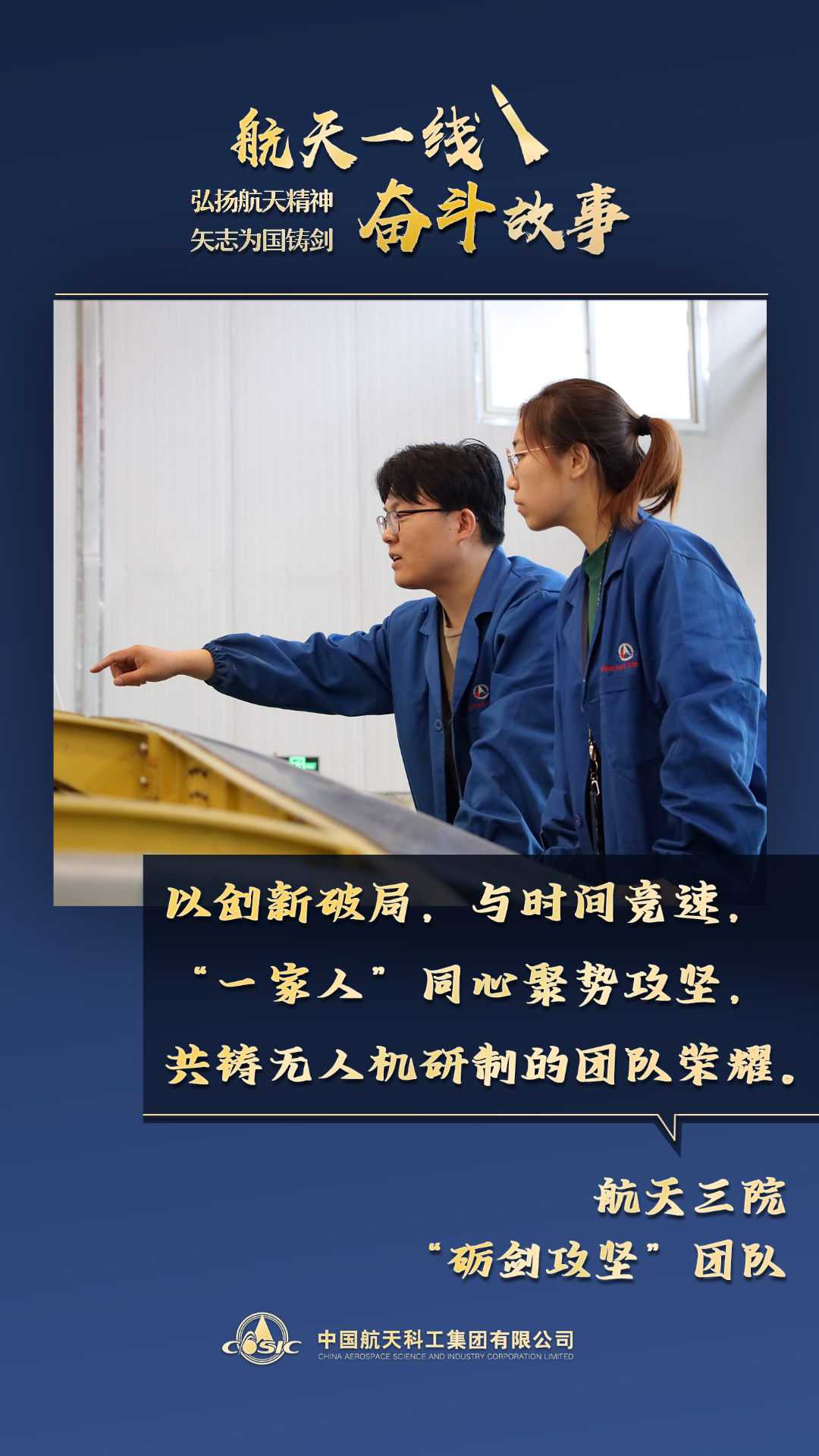 跑道上的引擎轟鳴,是航天人向藍(lán)天遞交的答卷。為了這一天,團(tuán)隊(duì)鏖戰(zhàn)三載,在無(wú)人涉足的技術(shù)盲區(qū)里闖路。何工從日常生活中捕捉靈感,以創(chuàng)新設(shè)計(jì)攻克機(jī)翼難題;飛測(cè)組頂著壓力與時(shí)間賽跑,三天完成八日任務(wù);熱試車(chē)遇阻時(shí),“一家人”跨團(tuán)隊(duì)打破壁壘聯(lián)手攻關(guān)。航天精神從不是口號(hào),是扎根每個(gè)細(xì)節(jié)的堅(jiān)守;也是融入點(diǎn)滴付出的擔(dān)當(dāng)。三院無(wú)人機(jī)團(tuán)隊(duì)初心如磐,步履不停,讓無(wú)人機(jī)的轟鳴聲成為建設(shè)世界一流航天防務(wù)企業(yè)的奮進(jìn)強(qiáng)音。(文/程凱強(qiáng)、李政昊 海報(bào)/張彤、杜宜桓)