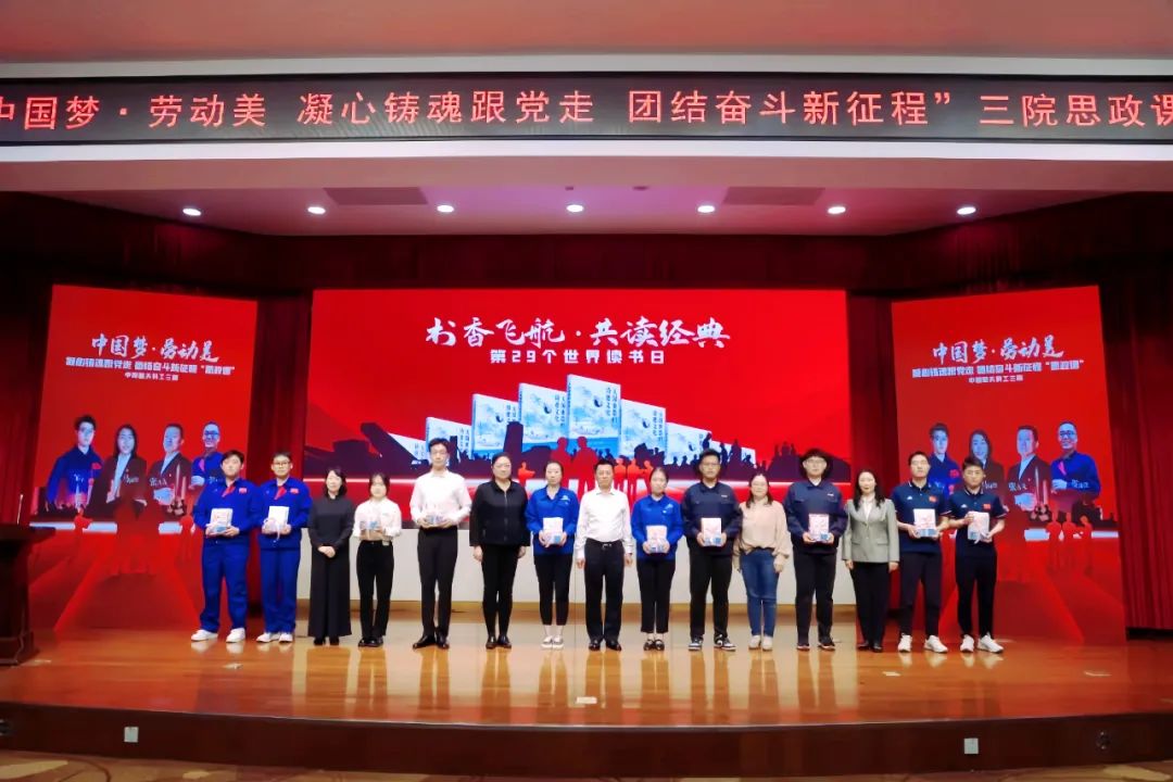 思政課舉辦之際,正逢中國航天日和世界讀書日,三院工會根據(jù)全國職工書屋開展千萬職工共讀經(jīng)典主題活動的安排,在思政課現(xiàn)場,向全體職工推介《大國重器的詩意文化》一書,在場領(lǐng)導向職工代表贈送《大國重器的詩意文化》等書籍。
