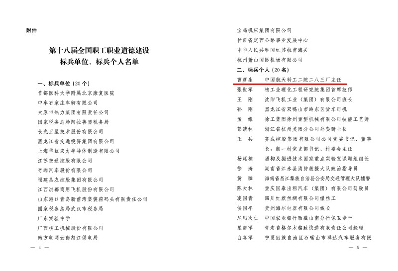 近日,中國航天科工二院283廠職工曹彥生獲得第十八屆全國職工職業(yè)道德建設標兵個人稱號。